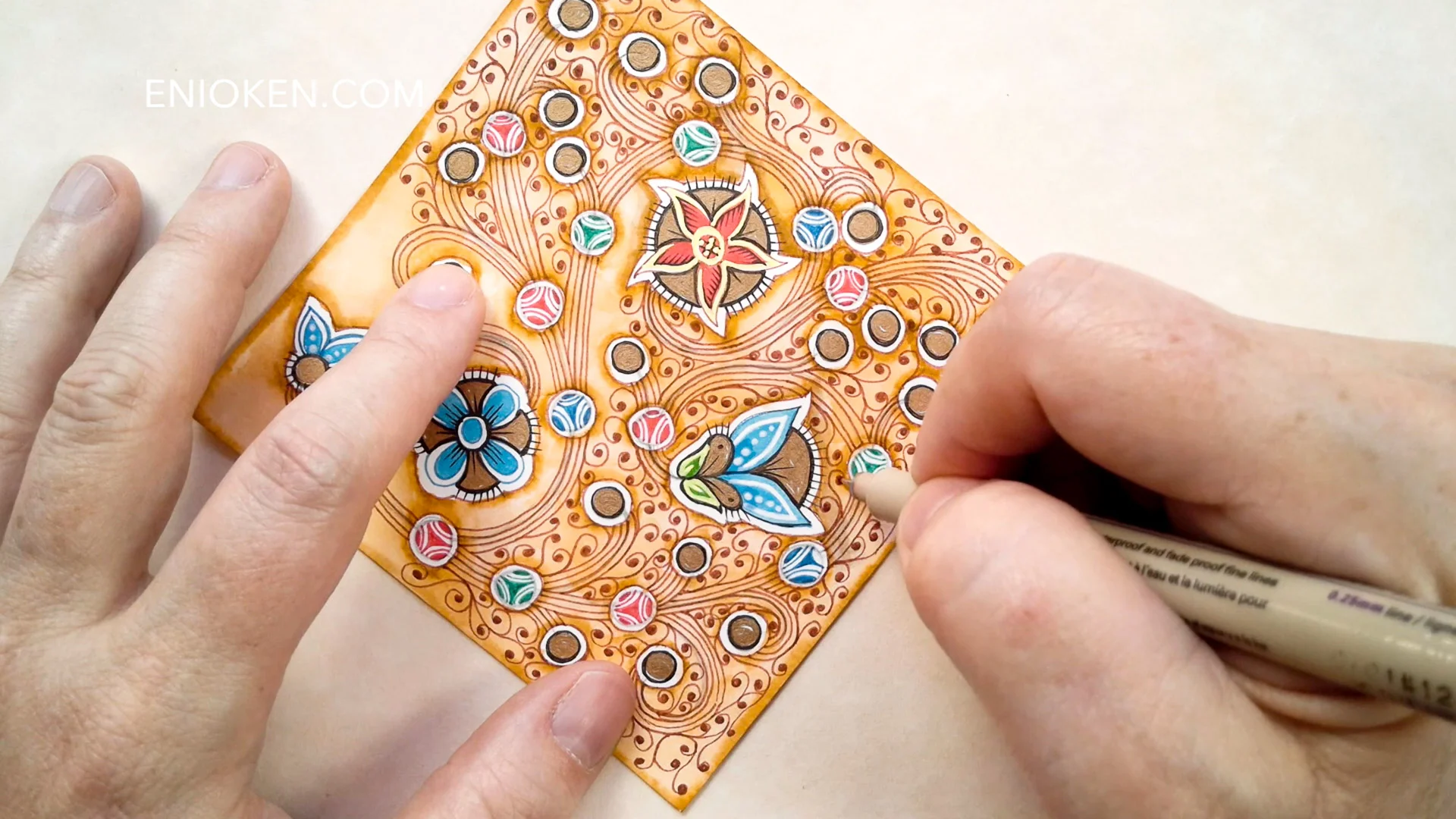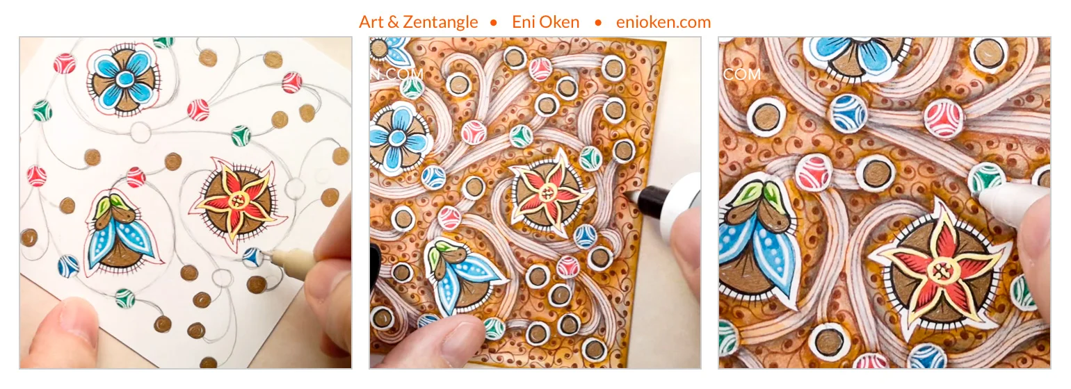 Another thing that I really, really like about this lesson is that although it is not exactly Zentangle, it has a profoundly meditative quality to is, not only during the time when we create endless little vines, but also during the painting of the background. Soooo much Zen flow!!! So relaxing!
