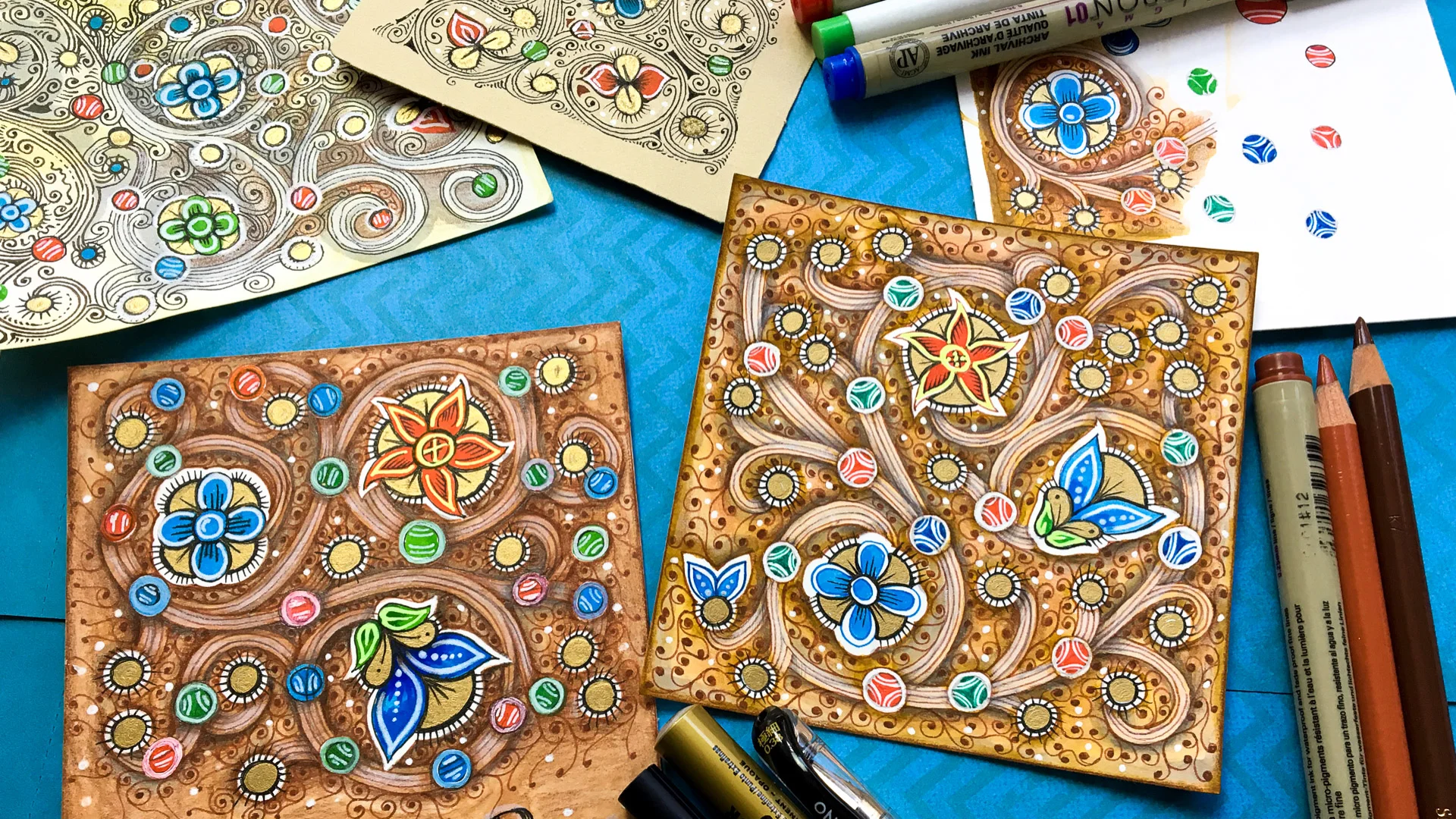 The lesson uses a ton of materials, but the part that I love the most is when you finally blend in those layers of color and the results produce that rich, deep colored shading, which makes the rest of the design simply pop.